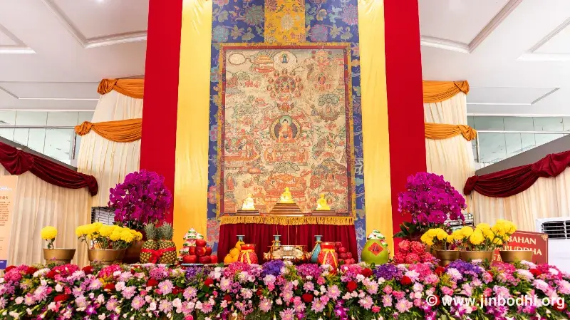 Grandmaster JinBodhi personally attended the event, bringing warmth and blessings to all. A massive thangka depicting the Buddha’s noble life—from birth to enlightenment and teaching—was displayed, showcasing his extraordinary journey. The sacred bathing the Buddha ritual was not just traditional—it was also a spiritual purification.